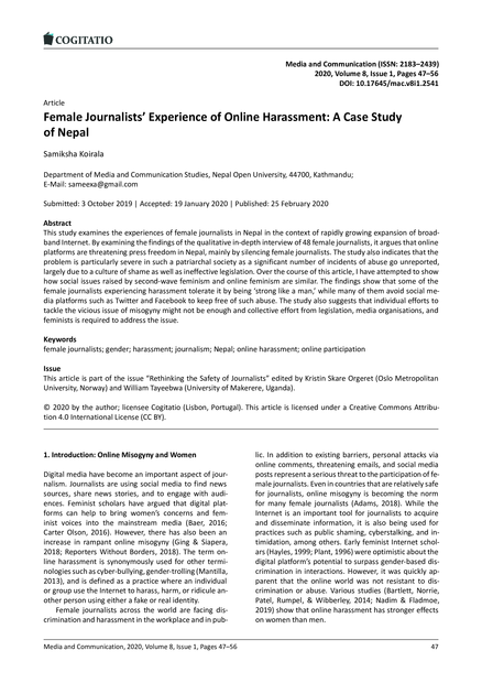"This study examines the experiences of female journalists in Nepal in the context of rapidly growing expansion of broadband Internet. By examining the findings of the qualitative in-depth interview of 48 female journalists, it argues that online platforms are threatening press freedom in Nepal, mainly by silencing female journalists. The study also indicates that the problem is particularly severe in such a patriarchal society as a significant number of incidents of abuse go unreported, largely due to a culture of shame as well as ineffective legislation. Over the course of this article, I have attempted to show how social issues raised by second-wave feminism and online feminism are similar. The findings show that some of the female journalists experiencing harassment tolerate it by being ‘strong like a man,’ while many of them avoid social media platforms such as Twitter and Facebook to keep free of such abuse. The study also suggests that individual efforts to tackle the vicious issue of misogyny might not be enough and collective effort from legislation, media organisations, and feminists is required to address the issue." (Abstract)