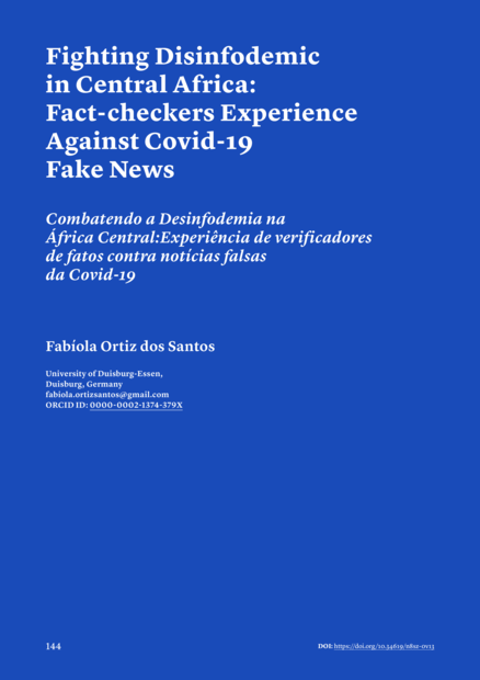 "This chapter discusses two cases of new media formats combining journalistic skills, creativity and innovation when communicating risk and acting against disinfodemic, the collaborative website ‘Talato’ for fact-checking on the coronavirus in CAR and the fact-checking online platform ‘Congo Check’ in the DRC. Their accounts feed the discussion of how disinfodemic is spreading in the region and how their communication strategies are serving as riposte against this major threat. The chapter sheds light to how these independent initiatives contribute to halt the pandemic disinfodemic in their localities. It moreover reveals fact-checking procedures and obstacles faced when journalists attempt to access verifiable and official information in settings where press is not entirely free to operate." (Abstract)
