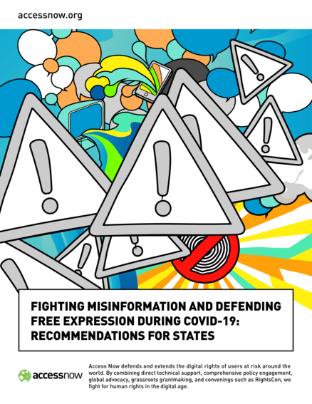 "In this paper, we provide recommendations for protecting freedom of expression and opinion and the right to impart and receive information to enable governments to fight the COVID-19 health crisis in a rights-respecting manner. There will be an aftermath to the COVID-19 outbreak and the measures governments put in place right now will determine what it will look like. The recommendations outlined below will help ensure that the rule of law, and the rights to freedom of expression and opinion, as well as the right to receive and to impart information, are protected throughout this crisis and in the future. Under no circumstances should any government allow people’s fundamental rights to fall victim to this pandemic." (Executive summary)