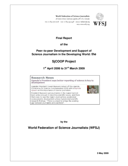 "SjCOOP1 objectives were to (1) develop a network of professional science journalists in Africa, North Africa and in the Middle East; (2) put in place national and regional associations of science journalists; and (3) strengthen the World Federation of Science Journalists as a supportive partner of science journalists in the developing world. In 2009, at the end of SjCOOP, networks of science journalists are now in place in Africa and in the Arab World. Each network is made of one regional association complemented by national associations. The African network includes nine national associations (6 created by SjCOOP) with a total membership of 408 journalists. The Arab network is mainly represented by a pan-Arab association with two national associations (created through SjCOOP) representing some 215 journalists. [...] Twelve associations from the developing world are now official members of the World Federation of Science Journalists and eight are twinned with associations in Asia, Europe and North America. This new global network in science journalism creates an incentive for better reporting and increased recognition of science journalists in the developing world." (Executive summary, page 6)
