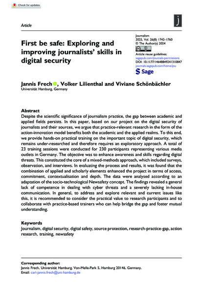 "Despite the scientific significance of journalism practice, the gap between academic and applied fields persists. In this paper, based on our project on the digital security of journalists and their sources, we argue that practice-relevant research in the form of the action-innovation model benefits both the academic and the applied realms. To this end, we provide hands-on practical training on the important topic of digital security, which remains under-researched and therefore requires an exploratory approach. A total of 23 training sessions were conducted for 230 participants representing various media outlets in Germany. The objective was to enhance awareness and skills regarding digital threats. This constituted the core of a mixed-methods approach, which included surveys, observation, and interviews. In evaluating the process and results, it was found that the combination of applied and scholarly elements enhanced the project in terms of access, commitment, contextualisation and depth. The data were analysed according to an adaptation of the socio-technological Newsafety concept. The findings revealed a general lack of competence in dealing with cyber threats and a severely lacking in-house communication. In general, to address and explore relevant and current issues like this, it is recommended to consider the practical value to research participants and to collaborate with practice-based trainers who can help bridge the gap and foster mutual understanding." (Abstract)