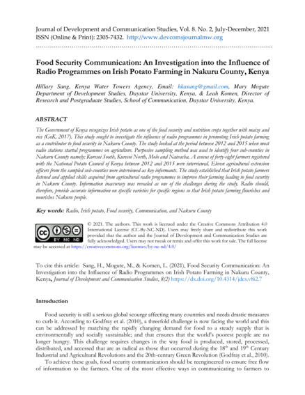 "The Government of Kenya recognizes Irish potato as one of the food security and nutrition crops together with maize and rice (GoK, 2017). This study sought to investigate the influence of radio programmes in promoting Irish potato farming as a contributor to food security in Nakuru County. The study looked at the period between 2012 and 2015 when most radio stations started programmes on agriculture. Purposive sampling method was used to identify four sub-counties in Nakuru County namely: Kuresoi South, Kuresoi North, Molo and Naivasha. A census of forty-eight farmers registered with the National Potato Council of Kenya between 2012 and 2015 were interviewed. Eleven agricultural extension officers from the sampled sub-counties were interviewed as key informants. The study established that Irish potato farmers listened and applied skills acquired from agricultural radio programmes to improve their farming leading to food security in Nakuru County. Information inaccuracy was revealed as one of the challenges during the study. Radio should, therefore, provide accurate information on specific varieties for specific regions so that Irish potato farming flourishes and nourishes Nakuru people." (Abstract)