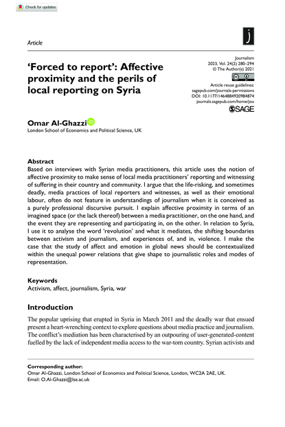 "Based on interviews with Syrian media practitioners, this article uses the notion of affective proximity to make sense of local media practitioners’ reporting and witnessing of suffering in their country and community. I argue that the life-risking, and sometimes deadly, media practices of local reporters and witnesses, as well as their emotional labour, often do not feature in understandings of journalism when it is conceived as a purely professional discursive pursuit. I explain affective proximity in terms of an imagined space (or the lack thereof) between a media practitioner, on the one hand, and the event they are representing and participating in, on the other. In relation to Syria, I use it to analyse the word ‘revolution’ and what it mediates, the shifting boundaries between activism and journalism, and experiences of, and in, violence. I make the case that the study of affect and emotion in global news should be contextualized within the unequal power relations that give shape to journalistic roles and modes of representaiton." (Abstract)