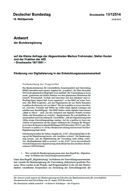 Förderung von Digitalisierung in der Entwicklungszusammenarbeit. Antwort der Bundesregierung auf die Kleine Anfrage der Abgeordneten Markus Frohnmaier, Stefan Keuter und der Fraktion der AfD