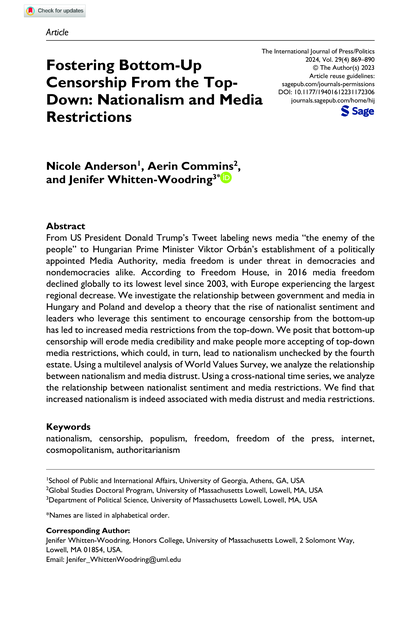 "From US President Donald Trump’s Tweet labeling news media “the enemy of the people” to Hungarian Prime Minister Viktor Orbán’s establishment of a politically appointed Media Authority, media freedom is under threat in democracies and nondemocracies alike. According to Freedom House, in 2016 media freedom declined globally to its lowest level since 2003, with Europe experiencing the largest regional decrease. We investigate the relationship between government and media in Hungary and Poland and develop a theory that the rise of nationalist sentiment and leaders who leverage this sentiment to encourage censorship from the bottom-up has led to increased media restrictions from the top-down. We posit that bottom-up censorship will erode media credibility and make people more accepting of top-down media restrictions, which could, in turn, lead to nationalism unchecked by the fourth estate. Using a multilevel analysis of World Values Survey, we analyze the relationship between nationalism and media distrust. Using a cross-national time series, we analyze the relationship between nationalist sentiment and media restrictions. We find that increased nationalism is indeed associated with media distrust and media restrictions." (Abstract)
