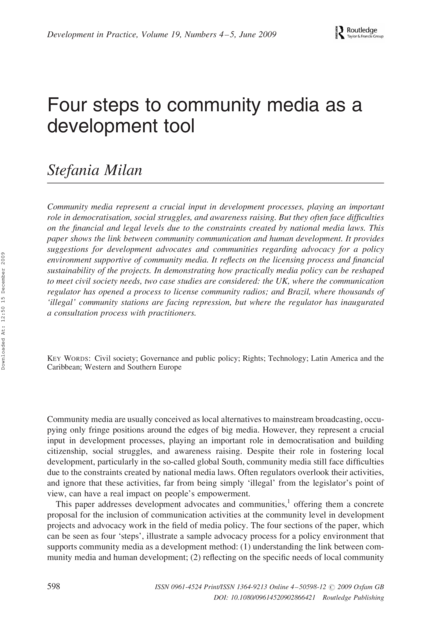 "Community media represent a crucial input in development processes, playing an important role in democratisation, social struggles, and awareness raising. But they often face difficulties on the financial and legal levels due to the constraints created by national media laws. This paper shows the link between community communication and human development. It provides suggestions for development advocates and communities regarding advocacy for a policy environment supportive of community media. It reflects on the licensing process and financial sustainability of the projects. In demonstrating how practically media policy can be reshaped to meet civil society needs, two case studies are considered: the UK, where the communication regulator has opened a process to license community radios; and Brazil, where thousands of ‘illegal’ community stations are facing repression, but where the regulator has inaugurated a consultation process with practitioners." (Abstract)