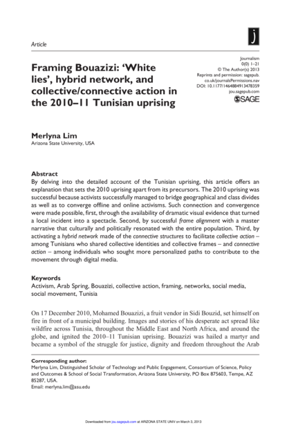 "By delving into the detailed account of the Tunisian uprising, this article offers an explanation that sets the 2010 uprising apart from its precursors. The 2010 uprising was successful because activists successfully managed to bridge geographical and class divides as well as to converge offline and online activisms. Such connection and convergence were made possible, first, through the availability of dramatic visual evidence that turned a local incident into a spectacle. Second, by successful frame alignment with a master narrative that culturally and politically resonated with the entire population. Third, by activating a hybrid network made of the connective structures to facilitate collective action – among Tunisians who shared collective identities and collective frames – and connective action – among individuals who sought more personalized paths to contribute to the movement through digital media." (Abstract)