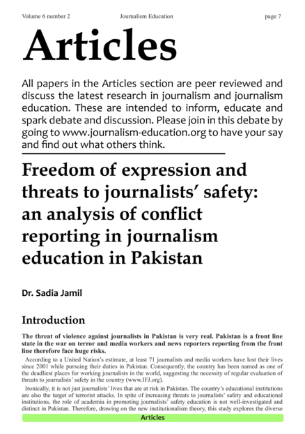 "This article has addressed the level of journalists’ safety in Pakistan, revealing the diverse threats to journalists’ safety and their right to freedom of expression in the country. Freedom of expression is an individual right, for which no one should be attacked or killed. However, in this study, journalists’ feedback reveals that not only their lives but their right to freedom of expression is at risk because of the prevailing unsafe environment in Pakistan. The study suggests journalism is a dangerous profession in Pakistan because of physical, psychological, financial, social, emotional and topic-specific risks, which constrain journalists’ right to freedom of expression and affect them most while doing their routine jobs. Despite the unsafe environment and constant threats, this study indicates that only 18% of surveyed journalists have received safety training to protect themselves in conflict and non-conflict situations. The following questions need to be addressed when analysing issues around journalists’ safety training in Pakistan, namely: who are the trainers? Are trainers themselves trained for journalists’ safety training, bearing in mind the local safety circumstances? What is the role of local and international NGO’s in promoting journalists’ safety education either at university or media organisational level? Further research on these aspects is crucial for the better training of journalists. This study reveals that the education of conflict reporting and peace journalism is not the major part of journalism curricula in Pakistan’s public and private sector universities. The curriculum in most of the universities do not reflect distinctively the local aspects of journalism teaching and approaches, which is important for enabling journalists to understand the context within which they perform their work. As highlighted by Abit and Kenneth in their article, the case of Kosovo is quite similar to Pakistan – where journalism education lacks local teaching approches. Therefore, in this article, I emphasize certain initiatives such as: the inclusion of journalists’ safety and peace journalism modules in curriculum; collaboration with international universities for innovative pedagogical models; regular curriculum revision and local-context teaching and research within this field. Others have underlined the need for a few more significant inititatives that I think are crucial as far as journalists’ safety education is concerned, such as: enhancing journalists’ awareness of their rights and physical and psychological safety; protection of their equipment, and legal protection while covering war or conflict." (Conclusion)