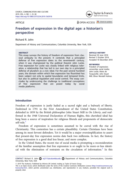 "Freedom of expression has a history. It is neither coeval with Christianity, as Catholic apologists sometimes assume, nor inherently valuable, as commentators in the United States often contend. On the contrary, it emerged in its modern form only in the seventeenth century as a byproduct of generations of horrific warfare between Catholics and Protestants. For John Locke, freedom of expression took the form of an appeal for religious toleration; in the Enlightenment, this appeal would become transmogrified into a principled defense of pluralism as a civic ideal. Innovations in the means of communications have often been disruptive. Yet the challenge posed by digital media is unusually stark. A new age calls for a new vision. The value of free expression is enhanced, and not diminished, if it is localized in time and space. Liberty is the ally, and not the antagonist, of political regulation and social control. What the sacred cause of liberty demands is not more free expression, but better free expression, and in the pursuit of this elusive yet essential goal, there is much to be done." (Conclusion)