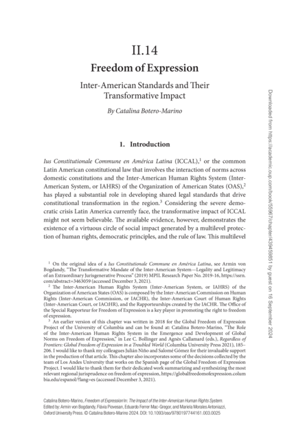 "This chapter has shown the positive relationship and virtuous circle between domestic authorities and international bodies that strengthens the protection of human rights by highlighting progress on two issues within the right to freedom of expression: criminalization and access to information. Eleven countries have repealed desacato laws, nine countries have limited the use of criminal law in cases of criticism leveled against public officials, and more than twenty- four countries have recognized the right of access to information. These evolving inter- American standards on freedom of expression seem to have been consolidated into ICCAL. This chapter does not mean to suggest that progress is necessarily constant or permanent. The right to freedom of expression has encountered strong opposition in countries such as Venezuela. There have already been significant setbacks in freedom of expression in Latin America and rising authoritarianism in the region has created additional threats to this right. Notwithstanding those challenges, there is no doubt that the relationship between the Inter- American System and domestic legal systems, including constitutional courts, has generated a transformation in international law and constitutional law across the region. Although we might not expect to see major advances in freedom of expression in the coming years, due to the challenge of rising authoritarianism, we do know that in States in which the judiciary continues to enjoy sufficient autonomy inter- American standards have curbed authoritarian attacks on individual rights. International standards lend domestic courts the legitimacy they need to rebuff authoritarian advances in contexts of political polarization." (Concluding remarks, pp. 493-494)