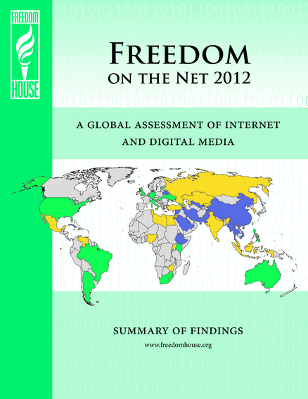 "This report is the third in a series of comprehensive studies of internet freedom around the globe and covers developments in 47 countries that occurred between January 2011 and May 2012. Over 50 researchers, nearly all based in the countries they analyzed, contributed to the project by researching laws and practices relevant to the internet, testing the accessibility of select websites, and interviewing a wide range of sources. This year's findings indicate that restrictions on internet freedom in many countries have continued to grow, though the methods of control are slowly evolving, becoming more sophisticated and less visible. Brutal attacks against bloggers, politically motivated surveillance, proactive manipulation of web content, and restrictive laws regulating speech online are among the diverse threats to internet freedom emerging over the past two years. Nevertheless, several notable victories have also occurred as a result of greater activism by civil society, technology companies, and independent courts, illustrating that efforts to advance internet freedom can yield results." (www.freedomhouse.org, January 14, 2013)