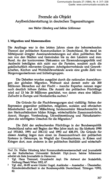 "Die Asylfrage war in den letzten Jahren eines der beherrschenden Themen der politischen Kommunikation in Deutschland. Sie stand imMittelpunkt erregter Auseinandersetzungen auf allen politischen Ebenen von den Städten und Gemeinden bis zu den Ländern und zum Bund. An der kontroversen Diskussion um Einwanderungspolitik und Asylrecht beteiligten sich nicht nur die Parteien, sondern auch die gesellschaftlich relevanten Gruppen: Arbeitgeberverbände und Gewerkschaften, Kirchen und Wohlfahrtsverbände sowie eine große Zahl von Bürgerorganisationen und Initiativgruppen. Die Debatten wurden ausgelöst durch die nationalen Auswirkungen er globalen Migration. Weltweit sind derzeit mehr als 200 Millionen Menschen auf der Flucht - manche Experten nennen sogar noch deutlich höhere Zahlen. Die Anzahl der politischen Flüchtlinge wird auf 13 bis 20 Millionen geschätzt, von denen etwa eine Million Zuflucht in Europa und Nordamerika suchen."(Abstract)