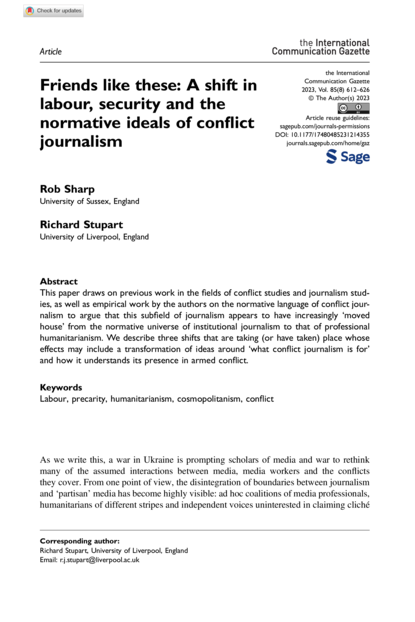 "This paper draws on previous work in the fields of conflict studies and journalism studies, as well as empirical work by the authors on the normative language of conflict journalism to argue that this subfield of journalism appears to have increasingly ‘moved house’ from the normative universe of institutional journalism to that of professional humanitarianism. We describe three shifts that are taking (or have taken) place whose effects may include a transformation of ideas around ‘what conflict journalism is for’ and how it understands its presence in armed conflict. (Abstract).