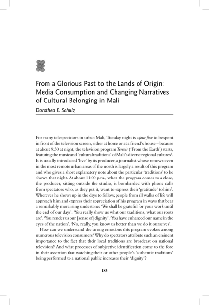 "This article explored the particular version of ‘national culture’ that emerged in Mali’s post-independent history at the interface of a governmental politics of culture and communication, media technologies, and people’s media engagement. I argued that the dialectical production of ‘the past’ as a source of cultural identity and nationalist pride was gradually transformed under the subsequent regimes of postcolonial Mali. Central parameters of claiming and validating one’s past have changed, along with a shift in significance (and employment) of ‘the past’. In previous decades, ‘remembering the past’ formed part of a hegemonic quest for a national heritage and an all-encompassing collective identity that tended to silence internal difference. This representation of national culture contrasts with more recent governmental attempts to create a sense of national unity not by reference to a common past but by acknowledging cultural diversity and celebrating the nation state’s capacity to ease out the tensions arising from internal difference. What conclusions can we draw from the shift from mass-mediated celebrations of oral traditions identified with practices of remembering an ‘authentic’ past to the staging of‘cultural diversity’ on state television? In what sense is this shift indicative of how individuals and groups need to frame and pursue their citizenship entitlements under current political conditions shaped by the effects of multiparty ‘democracy’?" (Conclusion, page 206)