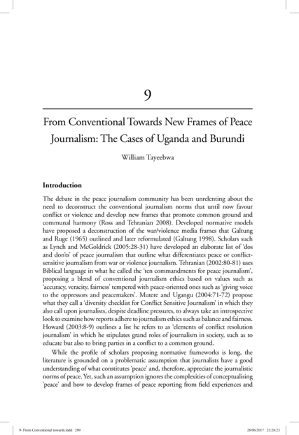 "The main task of the study was to evaluate, from the perspective of Burundian (n=58) and Ugandan (n=183) journalists the feasibility of making operational the normative frames of peace reporting as expounded by peace journalism scholars against the more entrenched news frames that favour conflict or violence [...] The findings discussed in this chapter show that, overall, Burundian and Ugandan journalists still emphasise the frames of conflict or violence as viable news values. The survey results confirm the claim by scholars who have observed that conventional journalism frames that favour conflict or violence are well-entrenched and routinely influence media content. The rootedness of the frames of conflict or violence is evident across gender and years of journalism experience. This rootedness is most likely due to the training which is still dependent on literature and models of what Galtung and Ruge identified as favouring the conflict or violence framing of news." (Conclusion, page 231-232)