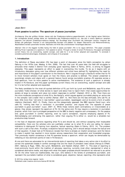 "One of the biggest hurdles facing the field of peace journalism (PJ) is its vague definition. This paper proposes defining PJ as it operates on a spectrum, from passive to active. Through a review of extant PJ literature, this paper synthesizes current theory into an overarching, explicit concept, and calls for it to be further adopted and expanded. To conclude it considers potential advantages, drawbacks, and critiques of its proposal." (Abstract)