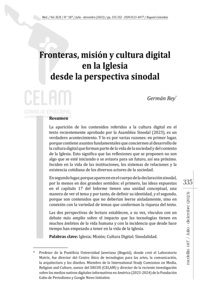 "La aparición de los contenidos referidos a la cultura digital en el texto recientemente aprobado por la Asamblea Sinodal (2023), es un verdadero acontecimiento. Y lo es por varias razones: en primer lugar, porque contiene asuntos fundamentales que conciernen al desarrollo de la cultura digital que forman parte de la vida de la sociedad y del contexto de la Iglesia. Esto significa que las reflexiones que se proponen no son algo que se esté iniciando o se avizora para un futuro, así sea próximo. Inciden en la vida de las instituciones, los sistemas de relaciones y la existencia cotidiana de los diversos actores de la sociedad. En segundo lugar, porque aparecen en el cuerpo de la declaración sinodal, por lo menos en dos grandes sentidos: el primero, las ideas expuestas en el capítulo 17 del Informe tienen una unidad conceptual, un manera de ver el tema y por tanto, de definir su identidad, y el segundo, porque son contenidos que no deberían leerse aisladamente, sino en conexión con la variedad de temas que conforman la riqueza del texto. Las dos perspectivas de lectura establecen, a su vez, vínculos con un debate más amplio sobre el impacto que las tecnologías tienen en muchos ámbitos de la vida humana y con la incidencia que desde hace tiempo han empezado a tener en la vida de la Iglesia." (Resumen)