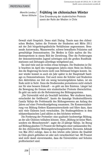Vor diesem Hintergrund überrascht es nicht, dass die Medien in Chile in Bezug auf die Darstellung der Studentenproteste voreingenommen gehandelt haben und immer noch handeln. Das ist nicht nur der Vorwurf vieler Demonstranten. Der chilenische Verband der Nichtregierungsorganisationen hat bereits im Juni 2011 beim nationalen Fernsehrat Klage gegen Kanal 13 eingereicht. Laut dem chilenischen Magazin „Publimetro“ wirft er dem Sender vor, „die sozialen Bewegungen zu kriminalisieren“ und hält die Berichterstattung für „eine ernsthafte Verzerrung, die Pluralismus, Demokratie und sozialen Frieden untergräbt“. Zudem werden Beamte des Bildungsministeriums beschuldigt, Bilder zu unterschlagen, die die Gewalt der Polizei gegen Demonstranten zeigen. Während internationale Medien wie „El País“ in Spanien und die „New York Times“ die Studentendemonstrationen im Hinblick auf ihre Forderungen analysieren und sie sogar mit dem „Arabischen Frühling“ vergleichen, wird das Verhalten der Studenten in den meisten chilenischen Medien kritisiert und verfälscht dargestellt, ohne auf die Inhalte der Protestierenden einzugehen. Auch die Zahl der Teilnehmer wurde durch die nationalen Medien manipuliert. Vielfach wurde sogar vermieden, überhaupt über die Demonstrationen zu berichten: Eine riesige chilenische Flagge mit dem Slogan „Ausbildung: frei, würdig, frei“ wurde während des Spiels zwischen den Fußball-Nationalmannschaften von Chile und Mexiko ausgerollt. Bei den offiziellen Übertragungen der chilenischen TV-Sender wurde diese Flagge jedoch ausgeblendet." (Seiten 231-232)