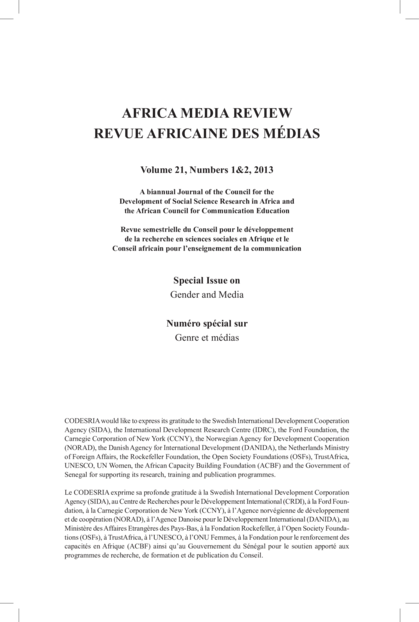 "The articles contained in this special issue build on the conversations initiated at the Cairo Symposium and try to make sense of the shifts and transformations in media and gender relations in Africa. Some bring new perspectives to bear on how traditional media (newspapers, magazines, radio and television) continue to be implicated in questions of gender, while others address new questions raised by new media forms and formats. Four articles (three in French and one in English) tackle the impact of ICTs and social media from different theoretical perspectives, locations and experiences (see Palmieri, Kane, Rouamba and Mbure). Three other articles examine the representational practices of newspapers and magazines in political and social discourses relating to gender (see Anate, Ossome and Eshiet). The contribution by Chiweshe and Bhatasara reflects on popular culture, specifically the construction of gender in music, while that of Yeboah and Thompson examine on the outstanding qualities that enable three women to rise to decision-making positions in the public relations, advertising and broadcast industries in Ghana." (Introduction, page 2-3)