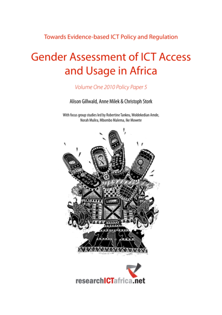 "What is clear from the Research ICT Africa (RIA) Household and Individual Access and Usage Survey is that the diffusion of ICT is highly uneven concentrating in urban areas and leaving some rural areas almost untouched. Access to these technologies is constrained by income as is usage, and as they become more complex, they are increasingly constrained by literacy and education. This analysis explores the inequities of access and usage further, by viewing them through a gender lens. Of the limited demand-side data on Africa that exists, very little is disaggregated on gender lines. This study provides a descriptive statistical overview of access to ICTs by women and men and their usage of them. This is supported by focus groups that were undertaken in five of the 17 countries surveyed in East, Central, South and West Africa. The survey reveals some surprising instances where more women than men own mobile phones, such as in South Africa and Mozambique, or where women have greater knowledge of the Internet such as in Cameroon. More generally however, the study confirms the differences in access by men and women to ICTs especially where they depend on public access." (Executive summary)