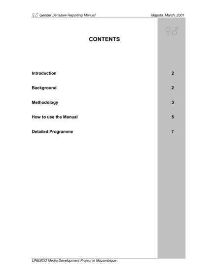 "This Gender Sensitive training package is divided into two component parts: The Manual and Reading Materials The two are parts of the whole and are mutually supportive. Although the manual can stand alone, the trainer needs the 'reading materials' to enable her/him to implement a knowledge-based in-depth course. The reading materials are organised in such a way as to fit into the intended 8-day training programme. The package is for trainers who are intent on furthering the interest of more gender sensitive reporting in the southern African media." (Introduction, page 2)