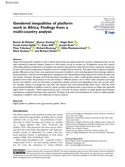 "Hopes that the growth of platform work in Africa will provide new opportunities for women’s employment have not yet been matched by empirical research. Based on a five-country survey of workers on 18 platforms across four sectors (ride-hailing, delivery, professional, microtasks), the research reported here makes the first direct, systematic comparison of men’s and women’s experiences of platform work in multiple African countries. The paper finds an absence of specific gender differences across many core operational structures of platform work including general shortcomings related to social protection, contracts, human/algorithmic management and representation being experienced similarly by both men and women. However, the paper also finds that these processes occur within a wider gender-unequal context in which gendered norms skew the presence of men and women in different sectors, and in which wider exclusions encourage women into platform work but lead them to experience greater precarity and dependency than men on that work.´For example, women on average earn less than men because they work demonstrably fewer hours. This also limits the purported flexibility of platform work for women workers and denies them a pay premium to reflect their generally higher levels of education. While experienced by only a minority of women workers surveyed, gender-discriminatory cancellations, complaints and abuse were reported. The paper ends with recommendations for actions to address gender inequalities in platform work, and reflections on future research." (Abstract)