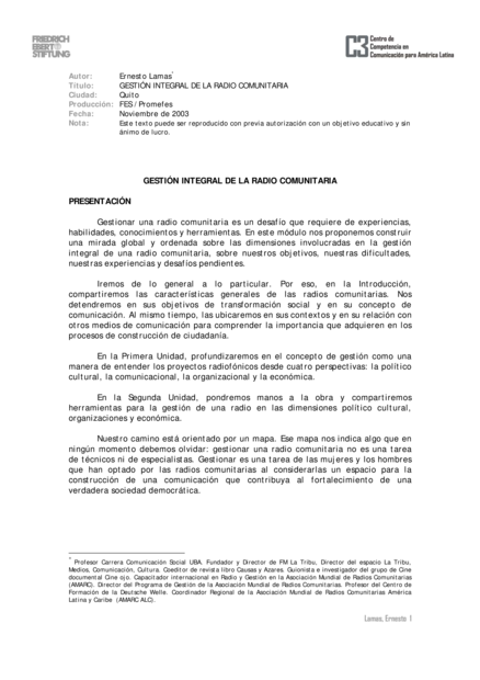 Quito: Friedrich-Ebert-Stiftung (FES), Centro de Competencia en Comunicación para América Latina (2003), 80 pp.