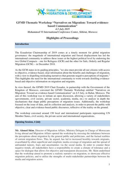 GFMD Thematic Workshop “Narratives on Migration: Toward Evidence-Based Communication”, 4-5 July 2019, Mohammed VI International Conference Center, Skhirat, Morocco: Highlights of Proceedings