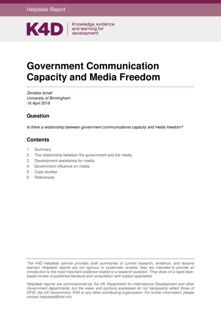 "This rapid literature review will focus on the influence of government communication on the government-media relationship. It does not encompass other avenues through which government is able to affect the media environment such as legislation, public policy and political culture. The role of the public media is briefly considered. This rapid literature review was able to find only one study, which examined the role of the government communication on media as part of a broader inquiry on the influence of government communication and public trust in the government of the United States (US) (Liu, Horsley, & Yang, 2012). Liu et al. (2012) found that there was a positive relationship between media interaction and good coverage of the US government. This finding suggests that governments may have an incentive to foster good relations with the media. The other main findings of the review are summarised below: Governments require a positive relationship with the media in order to communicate with the public and build legitimacy for their decisions (OECD, 2016); Media often rely on official government information, especially during war and conflict, and therefore need friendly relations with government to gain access to information (Yuksel, 2013); The engagement between elites, the media and the public is complex and is unlikely to be controlled or dominated by any particular set of actors (Yuksel, 2013); In some countries that were transitioning to democracy, development assistance for media has helped to foster media which is critical of the government, resulting in a tense relationship between media and government (Rub, 1996)" (Summary, page 2)