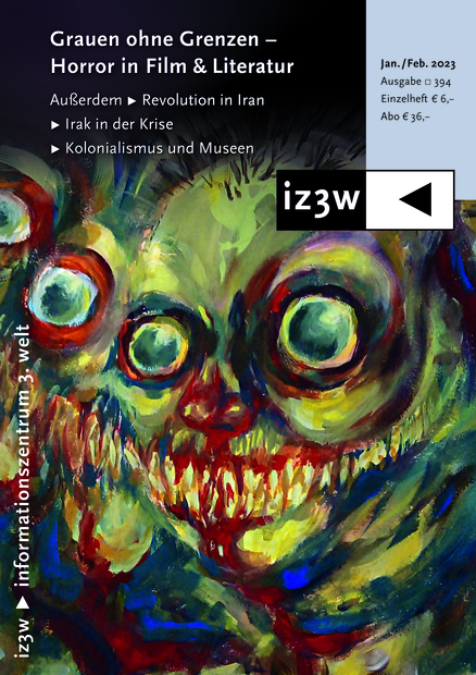 "Wie einst im ursprünglichen Gothic die verlassenen Schlösser des Feudalismus als Orte des Spuks in die bürgerliche Ära hineinragten, so sind es heute die globalen Ruinen des geplatzten Traums von Freiheit, Gleichheit und Brüderlichkeit, in denen das Grauen haust: Von den vom Immobiliencrash gezeichneten Vororten Detroits (Barbarian, 2022) bis zu den bleivergifteten Ufern des Riachuelo in Buenos Aires. Das sind düstere Aussichten: Eine Vergangenheit, die, wie Marx schrieb, »wie ein Alp auf dem Gehirne der Lebenden« lastet und eine Zukunft, in der wir, wie David Cronenberg zeigt, Plastik fressen müssen (Crimes of the Future, 2022). Der »Train to Busan« (2016) rast mit Hochgeschwindigkeit, doch auch am Zielbahnhof lauern die Zombies – und weil jede*r um das eigene Überleben kämpft, liegt der Griff nach der Notbremse fern. Da wird es unheimlich, oder im Sinne der Wortbedeutung: un-heimelig. Den das Un-heimliche verweist gerade auch auf den Schrecken, der hinter dem Vertrauten lauert. Und weil auf den Schrecken der Normalität zu verweisen immer schon Anliegen der iz3w ist, proklamieren wir: Gespenster aller Länder, vereinigt euch! Die Frage, was Horror und Gesellschafskritik verbindet, vertieft im Einleitungsartikel Georg Seeßlen (Seite 23). Danach bleiben wir dem globalen Spuk anhand ausgewählter Beispiele auf der Spur: Wie die argentinische Literatur Horrormotive nutzt, um die Schrecken von Diktatur und Postdiktatur auszudrücken, zeigt Nikolas Grimm (Seite 26). Dass sich realer und fiktiver Schrecken oft in nichts nachstehen, betont Rosaly Magg am Beispiel vom Horror der Flucht und Migration (Seite 36). Dazu gibt es zwei schaurige Interviews: mit dem Autor Mark H. Harris über Horror und Rassismus in den USA (Seite 32); und was Dracula in Istanbul treibt, erklärt uns der Regisseur Cem Kaya (Seite 40)." (Editorial, Seite 22)