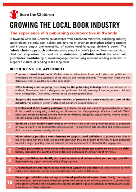 "In Rwanda, Save the Children collaborated with education ministries, publishing industry stakeholders, schools, book sellers and libraries in order to strengthen existing systems and increase output and availability of quality local language children’s books. This ‘whole chain’ approach addresses every step of a book’s journey from authorship to child and emphasizes the need for sustainable, profitable industries which will guarantee availability of local-language, contextually relevant reading materials to support a culture of reading in the long term." (Introduction)