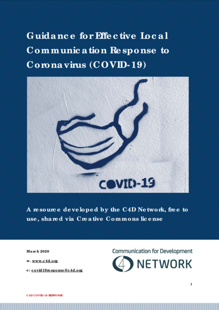 "This guide aims to provide some support in planning and delivering effective communications on the local level. It is for us all – the small community organisations as well as the larger NGOs, faith-based leaders and groups as well as media actors, officials and a wide range of other people who in varied walks of life are ‘communicators’ [...] To support our communication there are a range of initiatives and organisations producing resources, and in this guide, we aim to highlight some of the best of these, and also to share other trusted sources where more resources and information can be found." (Introduction)