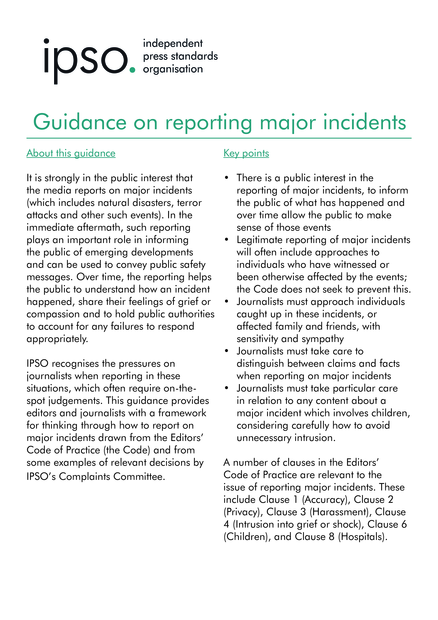 "There is a public interest in the reporting of major incidents, to inform the public of what has happened and over time allow the public to make sense of those events. Legitimate reporting of major incidents will often include approaches to individuals who have witnessed or been otherwise affected by the events; the Code does not seek to prevent this. Journalists must approach individuals caught up in these incidents, or affected family and friends, with sensitivity and sympathy. Journalists must take care to distinguish between claims and facts when reporting on major incidents. Journalists must take particular care in relation to any content about a major incident which involves children, considering carefully how to avoid unnecessary intrusion." (Key points, p1)