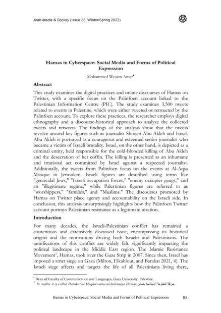 "This study examines the digital practices and online discourses of Hamas on Twitter, with a specific focus on the Palinfoen account linked to the Palestinian Information Centre (PIC). The study examines 3,500 tweets related to events in Palestine, which were either tweeted or retweeted by the Palinfoen account. To explore these practices, the researcher employs digital ethnography and a discourse-historical approach to analyze the collected tweets and retweets. The findings of the analysis show that the tweets revolve around key figures such as journalist Shireen Abu Akleh and Israel. Abu Akleh is portrayed as a courageous and esteemed senior journalist who became a victim of Israeli brutality. Israel, on the other hand, is depicted as a criminal entity, held responsible for the cold-blooded killing of Abu Akleh and the desecration of her coffin. The killing is presented as an inhumane and irrational act committed by Israel against a respected journalist. Additionally, the tweets from Palinfoen focus on the events at Al-Aqsa Mosque in Jerusalem. Israeli figures are described using terms like "genocidal Jews," "Israeli occupation forces," "enemy occupier gangs," and an "illegitimate regime," while Palestinian figures are referred to as "worshippers," "families," and "Muslims." The discourses promoted by Hamas on Twitter place agency and accountability on the Israeli side. In conclusion, this analysis unsurprisingly highlights how the Palinfoen Twitter account portrays Palestinian resistance as a legitimate reaction." (Abstract)