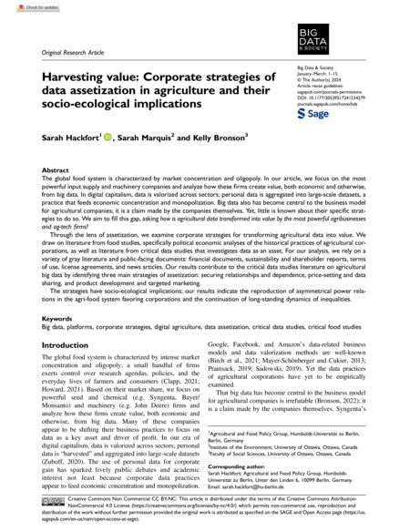 "The global food system is characterized by market concentration and oligopoly. In our article, we focus on the most powerful input supply and machinery companies and analyze how these firms create value, both economic and otherwise, from big data. In digital capitalism, data is valorized across sectors; personal data is aggregated into large-scale datasets, a practice that feeds economic concentration and monopolization. Big data also has become central to the business model for agricultural companies; it is a claim made by the companies themselves. Yet, little is known about their specific strategies to do so.We aim to fill this gap, asking how is agricultural data transformed into value by the most powerful agribusinesses and ag-tech firms? Through the lens of assetization, we examine corporate strategies for transforming agricultural data into value. We draw on literature from food studies, specifically political economic analyses of the historical practices of agricultural corporations, as well as literature from critical data studies that investigates data as an asset. For our analysis, we rely on a variety of gray literature and public-facing documents: financial documents, sustainability and shareholder reports, terms of use, license agreements, and news articles. Our results contribute to the critical data studies literature on agricultural big data by identifying three main strategies of assetization: securing relationships and dependence, price-setting and data sharing, and product development and targeted marketing. The strategies have socio-ecological implications; our results indicate the reproduction of asymmetrical power relations in the agri-food system favoring corporations and the continuation of long-standing dynamics of inequalities." (Abstract)