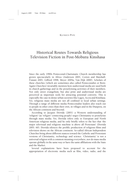 "In this article I primarily focus upon locally produced television serials (also called maboke, théâtre populaire, or télédramatiques), which constitute one important genre that help to spread what some describe as the Pentecostalist ideology. The main theme of Kinshasa’s post-millennial teledramas is the spiritual battle (Li. litumba ya molimo). They show how the Devil and his accomplices (demons and witches) operate in the material world and thus combat the Christian God. Witches, fools and pastors are the main protagonists of the teleserials. The programmes often conclude with confessions and deliverances. Such rituals are connected with understandings of evil and culturally accepted means of restoration and purification. The moral progression of the serials’ protagonists reflects a didactic purpose, showing the audience how to become a good Christian and how to hold strong in the spiritual battle (Pype 2008). Special effects are deliberately deployed to make manifest the hidden workings of occult practitioners and the miraculous effects of prayers, deliverance rituals and Christian expertise. With regard to the serials’ format, the insertion of Christian songs at the beginning and ending of the episodes, the dropping of Biblical verses into scenes and display of Bible verses in the corners of the screen during the broadcasts indicate the Christian character of Kinshasa’s teleserials. All these characteristics relate both to the instructive goal of the serials and to the intentions of the dramatic artists to create a mood among the audience to watch the programs as divine lessons. As most of Kinshasa’s evangelising artists state, they aim at bringing a spiritual awareness to the audience. They also hope to transmit spiritual knowledge via the interplay of the fictitious narrative, the power of the Word (activated through the multiple Bible verses that are pronounced) and the image (special effects such as visualisations of the occult). The main questions addressed here are how, why and when Kinshasa’s television serials have acquired this Pentecostalist character. I approach Kinshasa’s teleserials not at all as quasi-timeless symbolic documents but as cultural products that carry a history embedded in the significant political and cultural processes Kinois have witnessed." (Page 133)