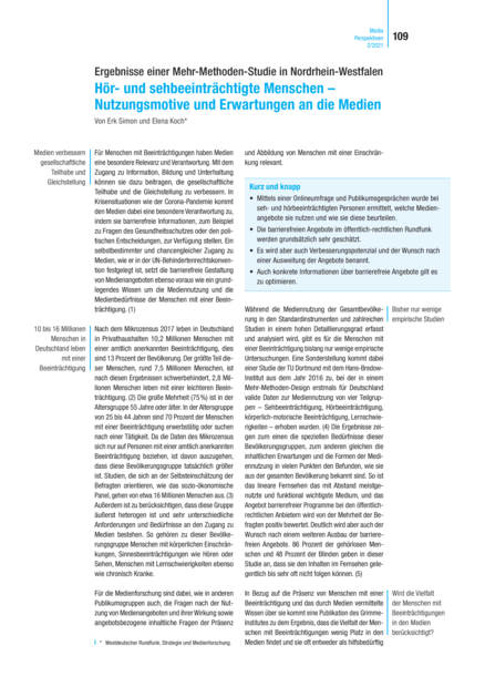 "Mittels einer Onlineumfrage und Publikumsgesprächen wurde bei seh- und hörbeeinträchtigten Personen ermittelt, welche Medienangebote sie nutzen und wie sie diese beurteilen. Die barrierefreien Angebote im öffentlich-rechtlichen Rundfunk werden grundsätzlich sehr geschätzt. Es wird aber auch Verbesserungspotenzial und der Wunsch nach einer Ausweitung der Angebote benannt. Auch konkrete Informationen über barrierefreie Angebote gilt es zu optimieren." (Seite 109)