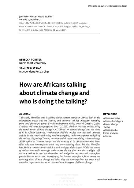 "This study identifies who is talking about climate change in Africa, both in the mainstream media and on Twitter, and analyses the key messages emerging from the different platforms. For the mainstream media, we used Google’s Global Database of Events, Language and Tone (GDELT) platform to access articles using the search terms ‘climate change AND Africa’ or ‘climate change’ and the name of all 54 African countries. We then identified the top five countries with the most articles in the sample and using random sampling, undertook a frame analysis of the articles. Regarding Twitter, we downloaded tweets containing ‘climate change AND Africa’ or ‘climate change’ and the name of all 54 African countries, identified who was tweeting and what they were tweeting about. We also identified key African climate change activists and analysed their tweets. While the nature of mainstream media coverage varies across the top five countries, a slight shift towards articles focused on adaptation and mitigation was observed, away from purely disaster narratives. Worryingly, for Twitter, very few African voices are tweeting about climate change and what they are tweeting does not draw much attention to pertinent issues on the continent in respect of climate change." (Abstract)