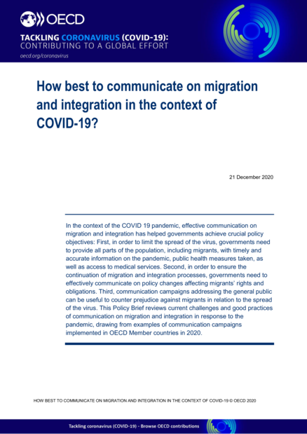 "In the context of the COVID 19 pandemic, effective communication on migration and integration has helped governments achieve crucial policy objectives: First, in order to limit the spread of the virus, governments need to provide all parts of the population, including migrants, with timely and accurate information on the pandemic, public health measures taken, as well as access to medical services. Second, in order to ensure the continuation of migration and integration processes, governments need to effectively communicate on policy changes affecting migrants’ rights and obligations. Third, communication campaigns addressing the general public can be useful to counter prejudice against migrants in relation to the spread of the virus. This Policy Brief reviews current challenges and good practices of communication on migration and integration in response to the pandemic, drawing from examples of communication campaigns implemented in OECD Member countries in 2020." (Page 1)