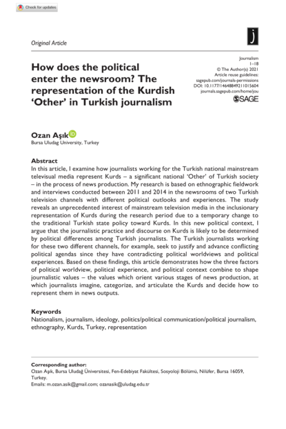 "In this article, I examine how journalists working for the Turkish national mainstream televisual media represent Kurds – a significant national ‘Other’ of Turkish society – in the process of news production. My research is based on ethnographic fieldwork and interviews conducted between 2011 and 2014 in the newsrooms of two Turkish television channels with different political outlooks and experiences. The study reveals an unprecedented interest of mainstream television media in the inclusionary representation of Kurds during the research period due to a temporary change to the traditional Turkish state policy toward Kurds. In this new political context, I argue that the journalistic practice and discourse on Kurds is likely to be determined by political differences among Turkish journalists. The Turkish journalists working for these two different channels, for example, seek to justify and advance conflicting political agendas since they have contradicting political worldviews and political experiences. Based on these findings, this article demonstrates how the three factors of political worldview, political experience, and political context combine to shape journalistic values – the values which orient various stages of news production, at which journalists imagine, categorize, and articulate the Kurds and decide how to represent them in news outputs." (Abstract)