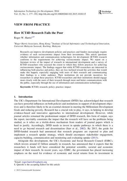 "Research can improve development policies and practices and funders increasingly require evidence of such socioeconomic impact from their investments. This article questions whether information and communication technologies for development (ICT4D) research conforms to the requirements for achieving socioeconomic impact. We report on a literature review of the impact of research in international development and a survey of ICT4D researchers who assessed the extent to which they follow practices for achieving socioeconomic impact. The findings suggest that while ICT4D researchers are interested in influencing both practice and policy, they are less inclined toward the activities that would make this happen, especially engaging with users of their research and communicating their findings to a wider audience. Their institutions do not provide incentives for researchers to adopt these practices. ICT4D researchers and their institutions should engage more closely with the users of their research through more and better communications with the public, especially through the use of information and communication technologies." (Abstract)