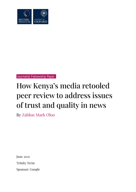 "Self regulation through peer review is a system whereby journalists hold each other accountable for the quality and accuracy of their content. If the Kenyan experience is anything to go by, this measure can provide an additional layer of scrutiny – additional to a state ombudsman or media houses’ internal quality controls – that is both quick and less prone to political interference. Having edited the the 'Media Observer' and contributed several reviews, I offer the following seven measures to take to ensure your own peer review programme is an effective tool in the fight to restore audience trust: Guard goodwill [...] Make it part of a routine [...] Consider hiring a public editor [...] Regularly review editorial policies [...] Communicate openly about external forces [...] More carrots, fewer sticks [...] Supplement with a mentorship programme." (Making peer review work for you, page 20-22)
