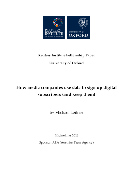 "Journalist fellow Michael Leitner takes a deep dive into media organisations who already use data to efficiently acquire, engage and furthermore keep subscribers. Do we need automated paywalls, and what data do we need to use to keep readers interested? Key Insights: Dynamic paywalls are no silver bullet solution; If you want to keep your subscribers, watch their behaviour; Predicting churn is easy, preventing it is hard; Privacy regulation adds a big question mark; New players focus on acquisition, first movers bet on retention; Don’t try to hit everything with the machine-learning hammer; Know who, what, and why you’re tracking; The newsroom needs to understand your goals and metrics; Create flexible structures, so everybody can participate; Content is still king over software and tech strategy." (Publisher description)