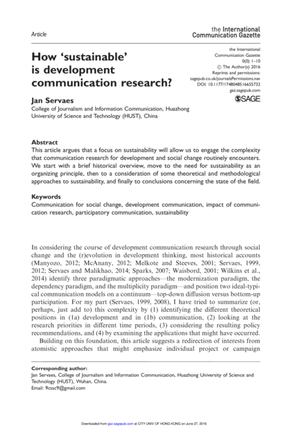 "This article argues that a focus on sustainability will allow us to engage the complexity that communication research for development and social change routinely encounters. We start with a brief historical overview, move to the need for sustainability as an organizing principle, then to a consideration of some theoretical and methodological approaches to sustainability, and finally to conclusions concerning the state of the field." (Abstract)