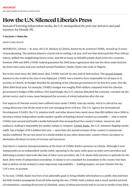"[...] Few aspects of Liberian society have suffered more under UNMIL than the media, which is critical for any young democracy but all the more so for one emerging from civil war. The U.S. Agency for International Development (USAID), the U.N. mission itself, and other donors have spent more than $10 million since 2003 to develop a robust independent media market capable of holding Liberia’s leaders accountable — only to watch UNMIL turn around and build a media behemoth that monopolized the country’s talent, resources, and audience, making it impossible for smaller outlets to compete. UNMIL Radio, the U.N. mission’s flagship media outfit, has a budget of $1.4 million this year — more than the annual revenue of the country’s commercial media combined. We are not aware of a media market in any other democratic country where one player so dominates all others in terms of revenue and resources. And there’s a massive misrepresentation at the heart of UNMIL Radio’s presence in Liberia. Although it now masquerades as an independent media outlet, operating in the same radio space as other news providers and delivering a product that looks like that of other news providers, the U.N. shows little interest or aptitude for the hard, dirty work of independent journalism. It claims to set a standard for journalism in the country but then fails to deliver on the industry’s most important responsibility — holding leaders, not just Liberia’s but the U.N.’s own, to account."