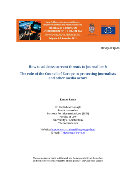 "Legal and political responses to the above issues will feature centrally in this paper. More specifically, the paper will consider the role of Council of Europe as a regional body in the concerted international efforts to enhance the protection of journalists and other media actors, in particular the implementation of the United Nations Plan of Action on the Safety of Journalists and the Issue of Impunity (hereafter: UN Plan of Action). It will do so in the context of an examination of some of the broader challenges of (re-)definition and (re-)orientation faced by a journalistic/media sector that is increasingly dynamic, diversified and diffuse." (Abstract)