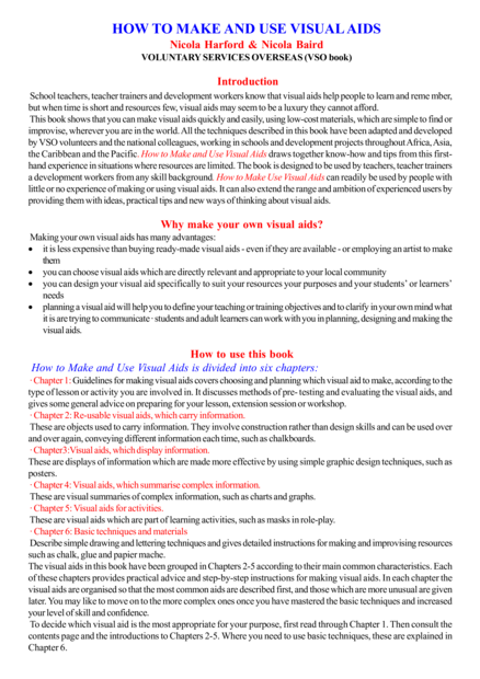 "School teachers, teacher trainers and development workers know that visual aids help people to learn and remember, but when time is short and resources few, visual aids may seem to be a luxury they cannot afford. This book shows that you can make visual aids quickly and easily, using low-cost materials, which are simple to find or improvise, wherever you are in the world. All the techniques described in this book have been adapted and developed by Voluntary Services Overseas (VSO) volunteers and the national colleagues, working in schools and development projects throughout Africa, Asia, the Caribbean and the Pacific. How to Make and Use Visual Aids draws together know-how and tips from this firsthand experience in situations where resources are limited. The book is designed to be used by teachers, teacher trainers a development workers from any skill background. How to Make Use Visual Aids can readily be used by people with little or no experience of making or using visual aids. It can also extend the range and ambition of experienced users by providing them with ideas, practical tips and new ways of thinking about visual aids." (Introduction)