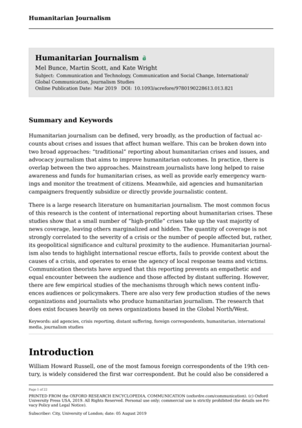 "Humanitarian journalism can be defined, very broadly, as the production of factual accounts about crises and issues that affect human welfare. This can be broken down into two broad approaches: “traditional” reporting about humanitarian crises and issues, and advocacy journalism that aims to improve humanitarian outcomes. In practice, there is overlap between the two approaches. Mainstream journalists have long helped to raise awareness and funds for humanitarian crises, as well as provide early emergency warnings and monitor the treatment of citizens. Meanwhile, aid agencies and humanitarian campaigners frequently subsidize or directly provide journalistic content. There is a large research literature on humanitarian journalism. The most common focus of this research is the content of international reporting about humanitarian crises. These studies show that a small number of “high-profile” crises take up the vast majority of news coverage, leaving others marginalized and hidden. The quantity of coverage is not strongly correlated to the severity of a crisis or the number of people affected but, rather, its geopolitical significance and cultural proximity to the audience. Humanitarian journalism also tends to highlight international rescue efforts, fails to provide context about the causes of a crisis, and operates to erase the agency of local response teams and victims. Communication theorists have argued that this reporting prevents an empathetic and equal encounter between the audience and those affected by distant suffering. However, there are few empirical studies of the mechanisms through which news content influences audiences or policymakers. There are also very few production studies of the news organizations and journalists who produce humanitarian journalism. The research that does exist focuses heavily on news organizations based in the Global North/West." (Summary)