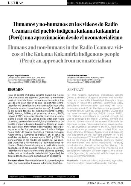 "Para el pueblo indígena kukama kukamiria (Perú), una diversidad de agentes (humanos y no-humanos) se interrelacionan de manera constante a trav és de una gran red en la que los distintos entrelazamientos permiten una comunicación asociativa (contraria a una comunicación social). A partir de la propuesta teórica del neomaterialismo (Lemos, 2013; Lemos, 2020) y el actor-red (Latour, 2005; Latour, 2012), esta coexistencia relacional es estudiada a través de los videos producidos por Radio Ucamara, perteneciente y dirigida por miembros del pueblo indígena kukama kukamiria. Desde un análisis cualitativo, transversal, observacional-descriptivo, se estudian los procesos comunicativos indígenas a partir de cuatro canciones (Parana, Omagua, Aparecimos y Kamatia) aparecidas en el canal de YouTube de Radio Ucamara entre 2015 y 2019. Se pone énfasis en los modos de existencia, las agencias (humanas y no-humanas) y las mediaciones radicales. El estudio concluye que, a partir de la teoría aplicada, es en las propias mediaciones (los entrelazamientos y asociaciones entre distintos agentes) en las que se produce la materialidad (agencias), las cuales dan forma a una comunicación asociativa." (Abstract)