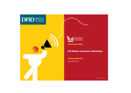 "The purpose of the one day ICD workshop on media assistance was to raise the profile of media for development within DFID, to share media assistance strategies and good practice with organisations and individuals engaged in the field of development communications, and to chart a way forward for both DFID and the wider development community." (introduction, page 2)